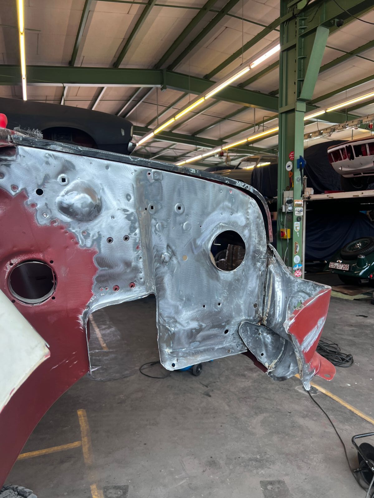 Die Löcher in der Front zu schließen war schwieriger als erwartet, gerade weil auf der verunfallten Seite nicht mehr viel Restblech vorhanden ist, aber wie sagt man so schön: Schlechte Schweißer sind gute Schleifer.