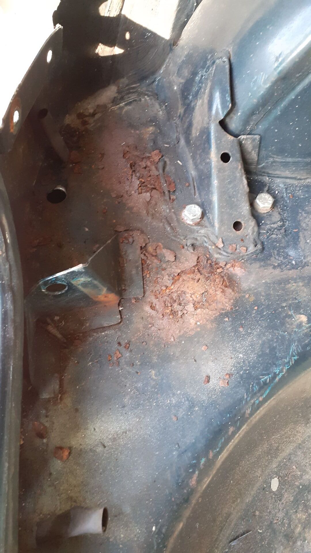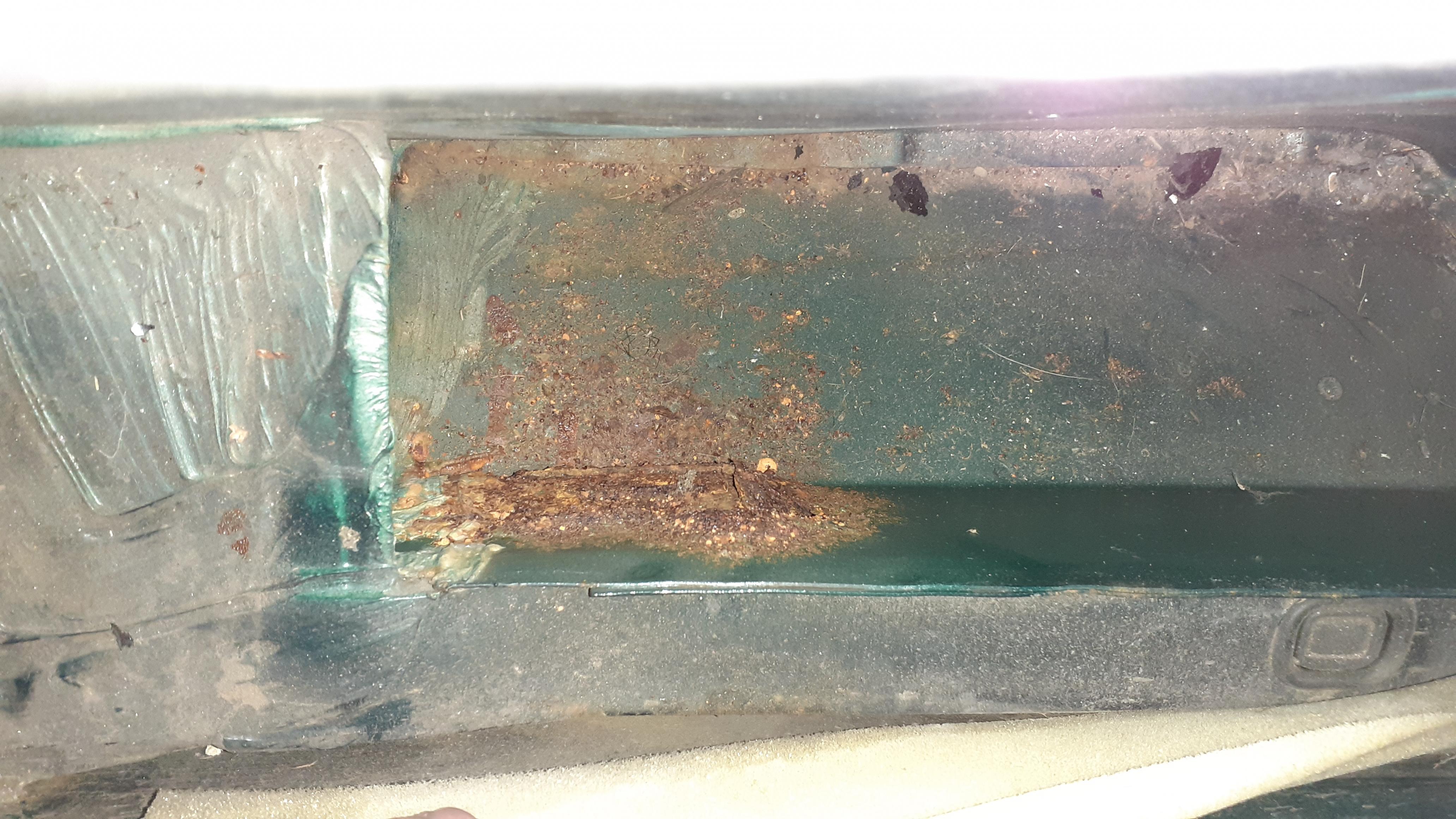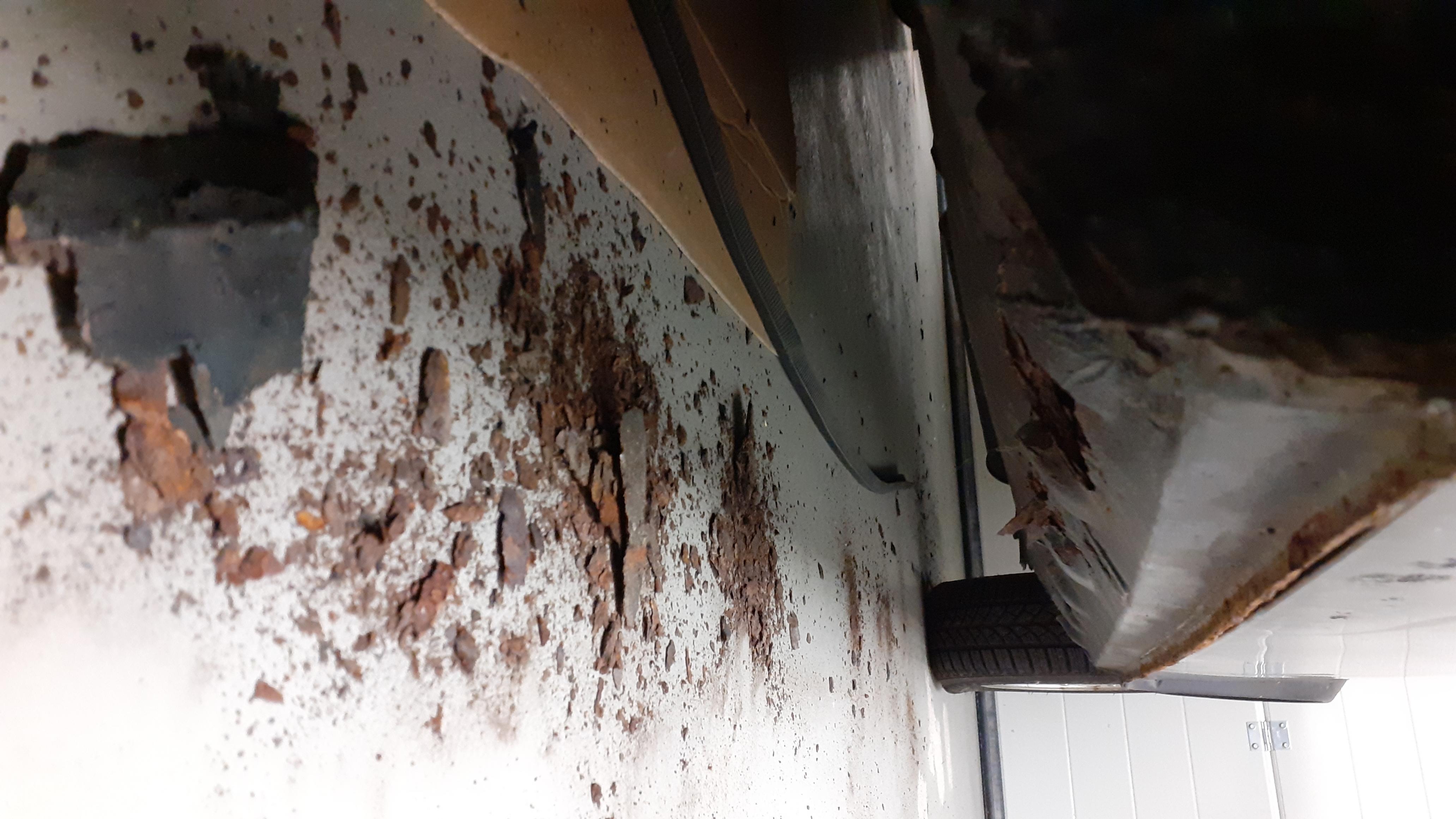 Also erstmal Innenraum/ Teppiche uws. raus und nach den Rostlöchern im Boden gesehen. Uter dem Bitumen im hinteren Bereich siehts noch ganz gesund aus. Vorne dagegen große Löcher im Schwellerbereich und Oberflächenrost am Boden.