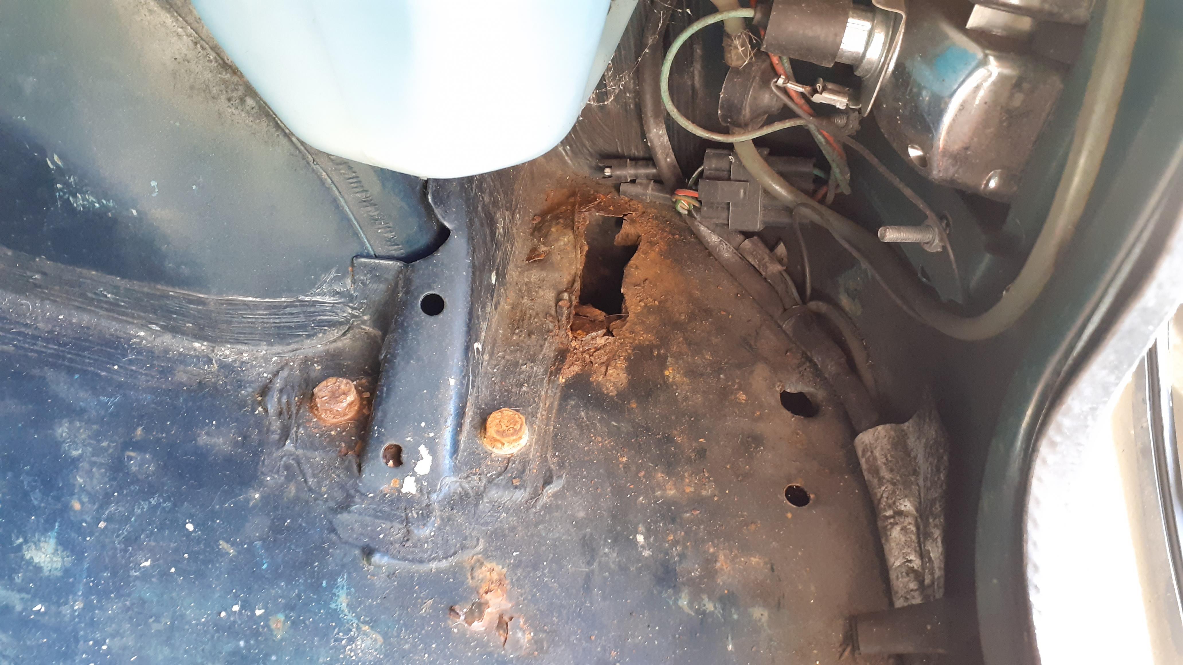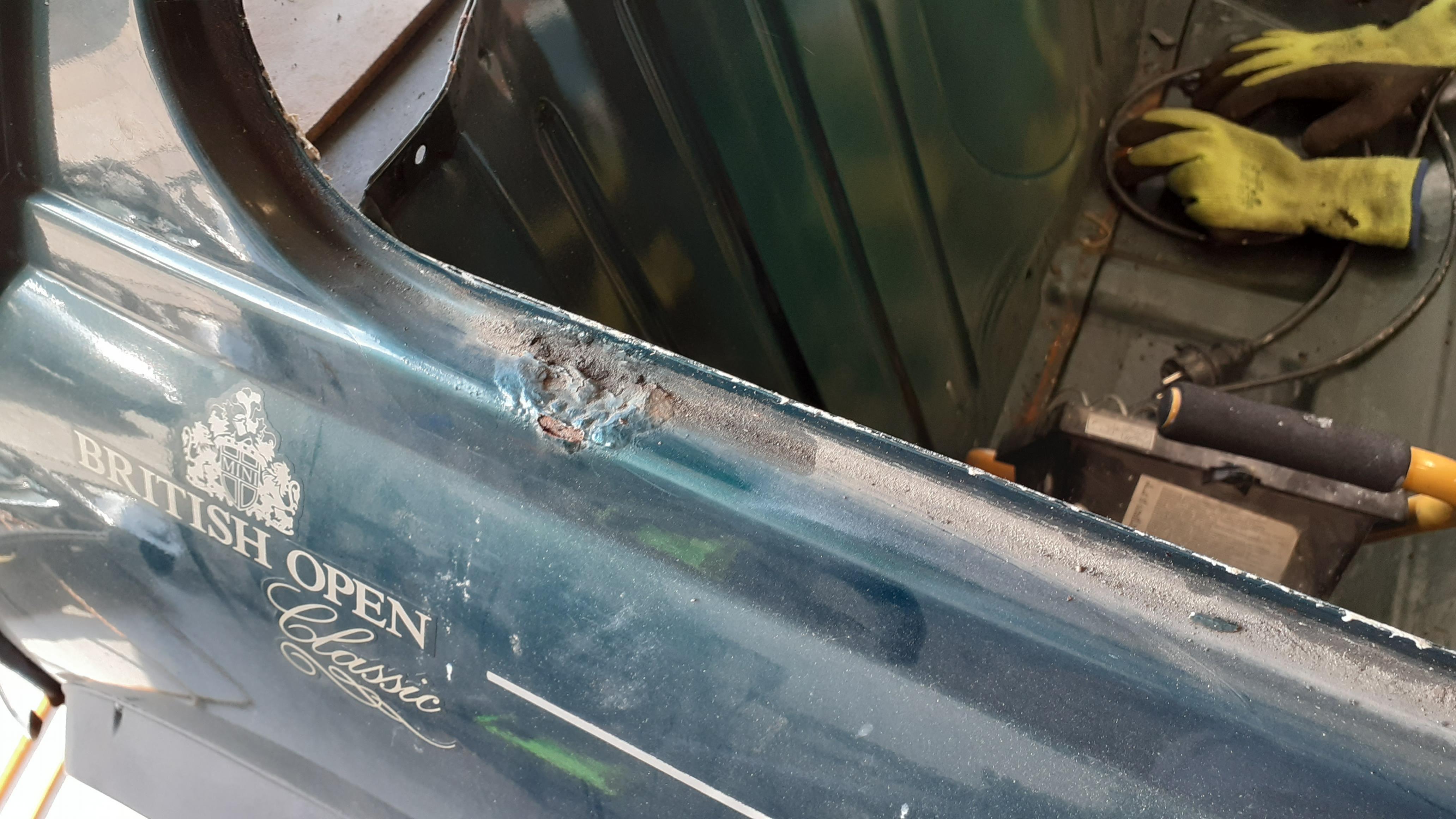 Ich bin zu dem Fahrzeug, das eigentlich für meine Bessere Hälfte gedacht ist, ganz überraschend gekommen. Meine Frau hat das Auto von einer Bekannten im Gespräch angeboten bekommen, da es wegen Versteigerung einer Immobilie "verschwinden" musste. Alternative wäre die Presse gewesen. Überreden ob sie den haben kann musste sie nicht viel, also haben wir das Auto angesehen. In einer wohl recht feuchten Garage stand der kleine dann also und hat uns mit seinen treuen Augen angesehen. Beim Blick unters Röckchen habe ich zuächst mal durchgerostete Schweller finden können. Der Motor konnte zwar nicht gestartet werden, aber immerhin hat der Anlasser durchgedreht und eine kurze Zündung konnte ich auch hören. So wie es aussihet, hat vor mir auch noch keiner wirklich Hand angelegt, ausser ein paar Kosmetik Versuche an kleineren Rostblasen an Tür, Scheibenrahmen etc. Die waren natürlich nicht von Dauer und sind schon wieder durchgekommen.