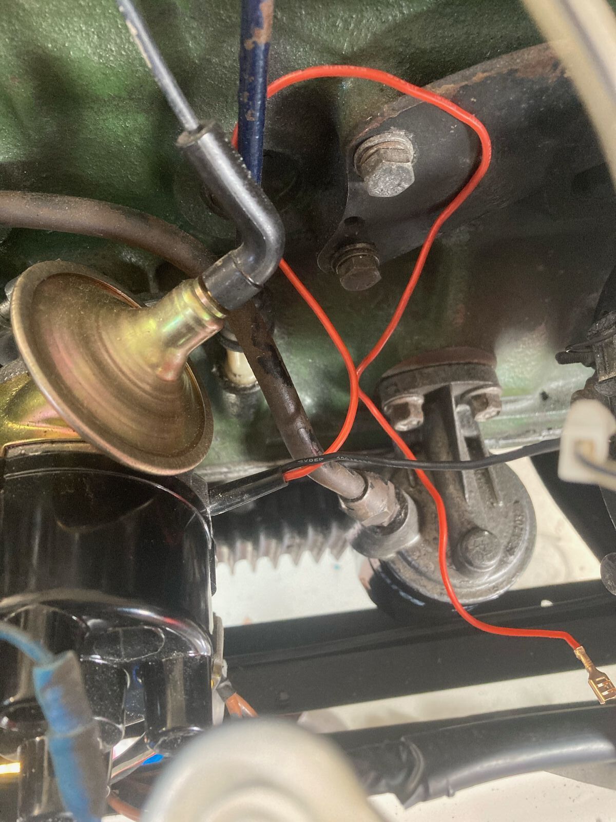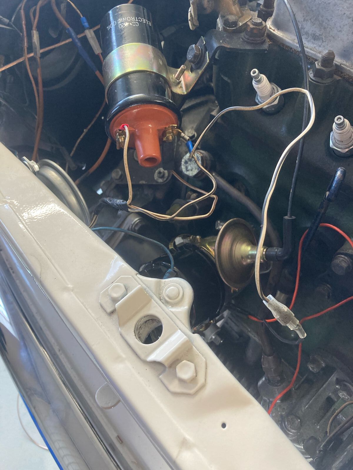 Zu deiner Frage mit dem weiß/braunen Kabel: Das gehört nicht an die Zündspule, sondern an den Öldruck-Schalter. Den sieht man auf dem dritten Foto, links vom Verteiler etwas oberhalb vom Anlasser...