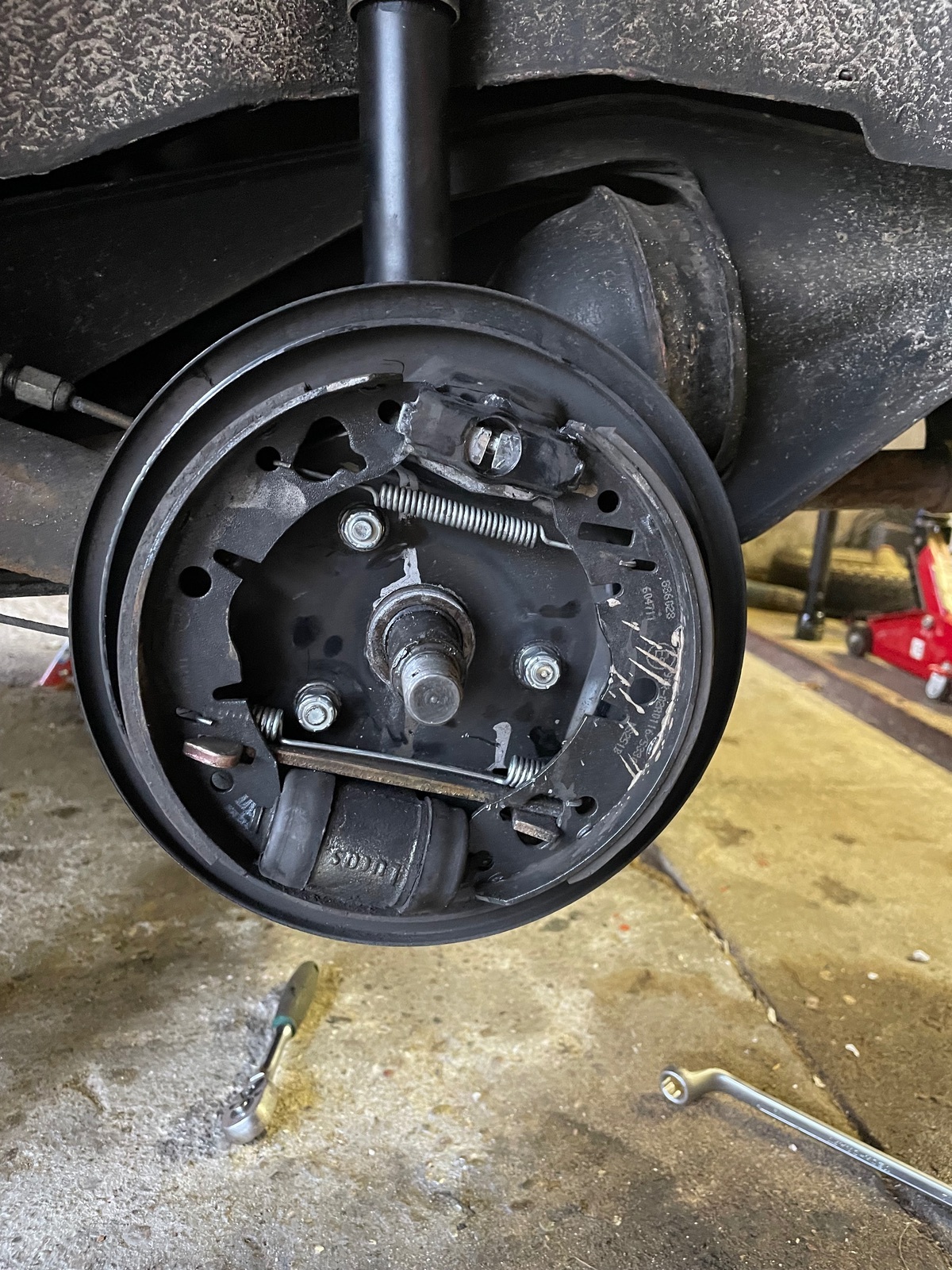 Mir war vor ein pa tagen ein Geräusch aufgefallen. Heute mal nach geschaut. Zum Glück.. Die hintere Bremse wurde im Mai zum TÜV in der Werkstatt komplett gemacht, seitdem war ich da außer nachstellen nicht mehr dran.. vielleicht sollte man da öfter mal nachgucken. Als ich da hinten dran war ist dann noch aufgefallen dass ein Auspuffgummi gerissen war. Also das auch einmal neu :)