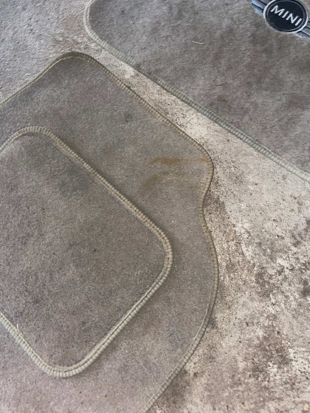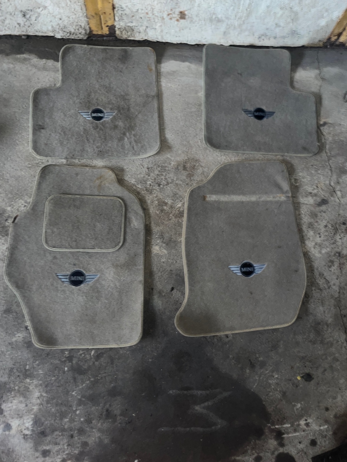 Hi ich hätte diese Fußmatten, sind vom Zustand her ok. Haben einige Rostwasser stellen und eine hat nen Abdruck. Sollten nochmal sauber gemacht werden.
