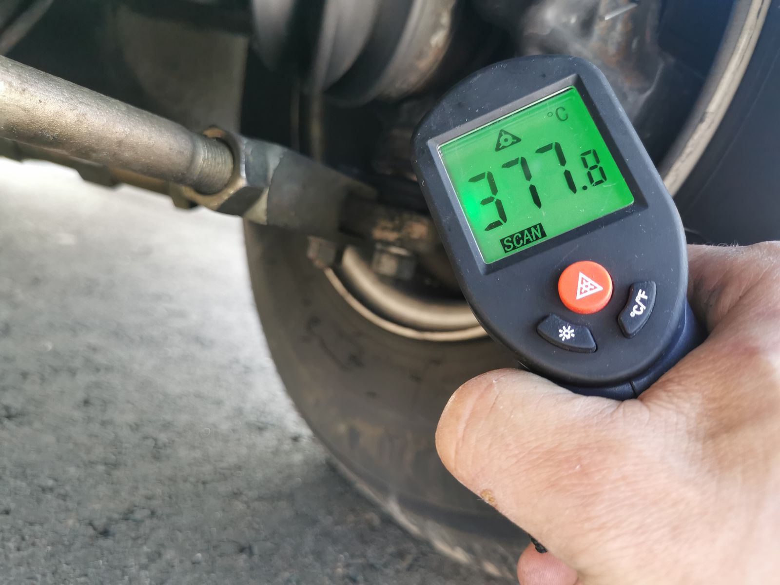 Anschließend bin ich noch einen zweiten Versuch gefahren, um gezielt das Versagen noch einmal zu provozieren und die Temperaturen zu messen. Scheibe 270-280° C, Sattel 60-70° C, Belagplatte 80° C.