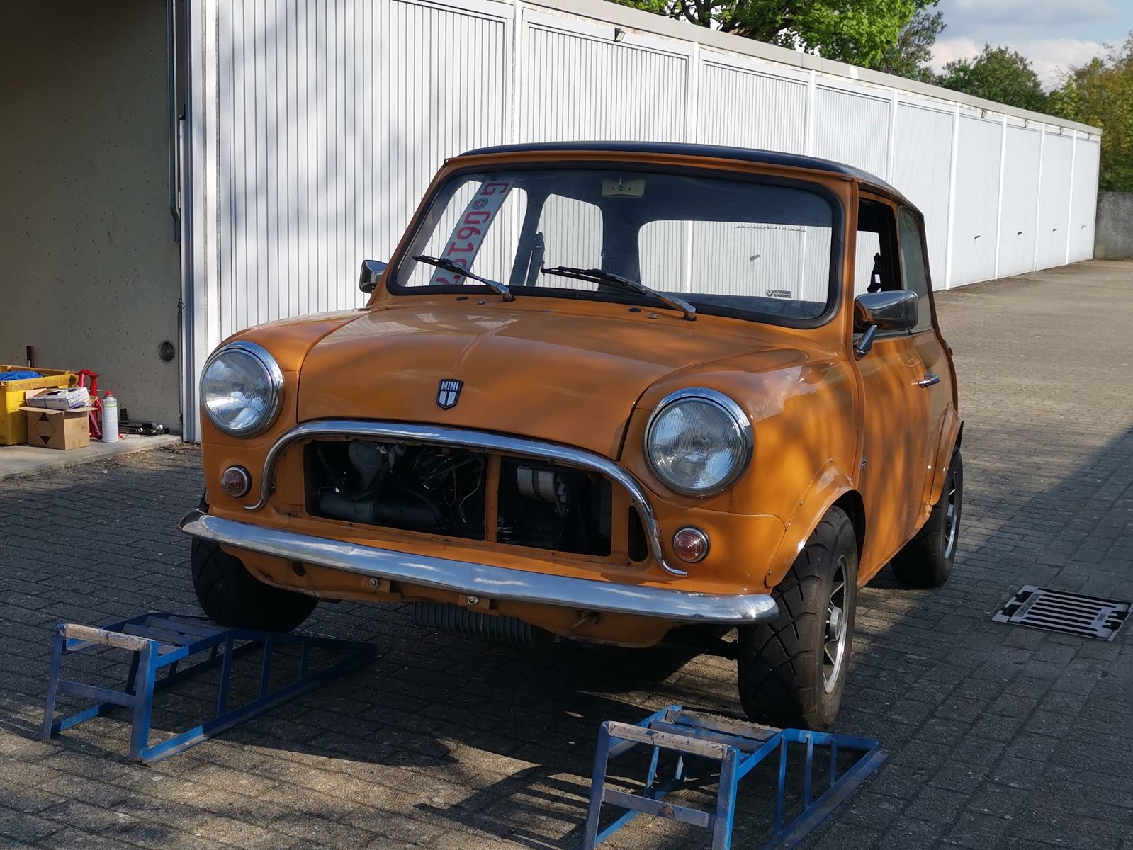Es handelt sich um einen 1977er Mini mit 1300 Inno Motor und HS2 Doppelvergaser, RC40 Anlage, Cooper S Scheibenbremsen...