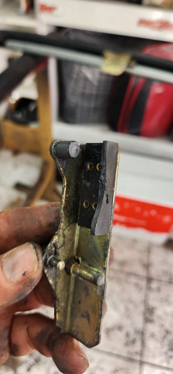 Der Sattler hat das Dach runter genommen und festgestellt, das die Seile gerissen sind. Die hat er erneuert, allerdings ist auch ein Teil, was ich nicht benennen kann gebrochen. Auf dem Bild ist es das Plastikteil, was am Blech genietet ist. Auf dem einen Bild ist noch die rechte Seite ganz.