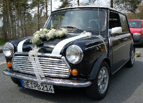 Der Mini hat die Farbe schwarz mit weißem Dach und rotem Teppich.