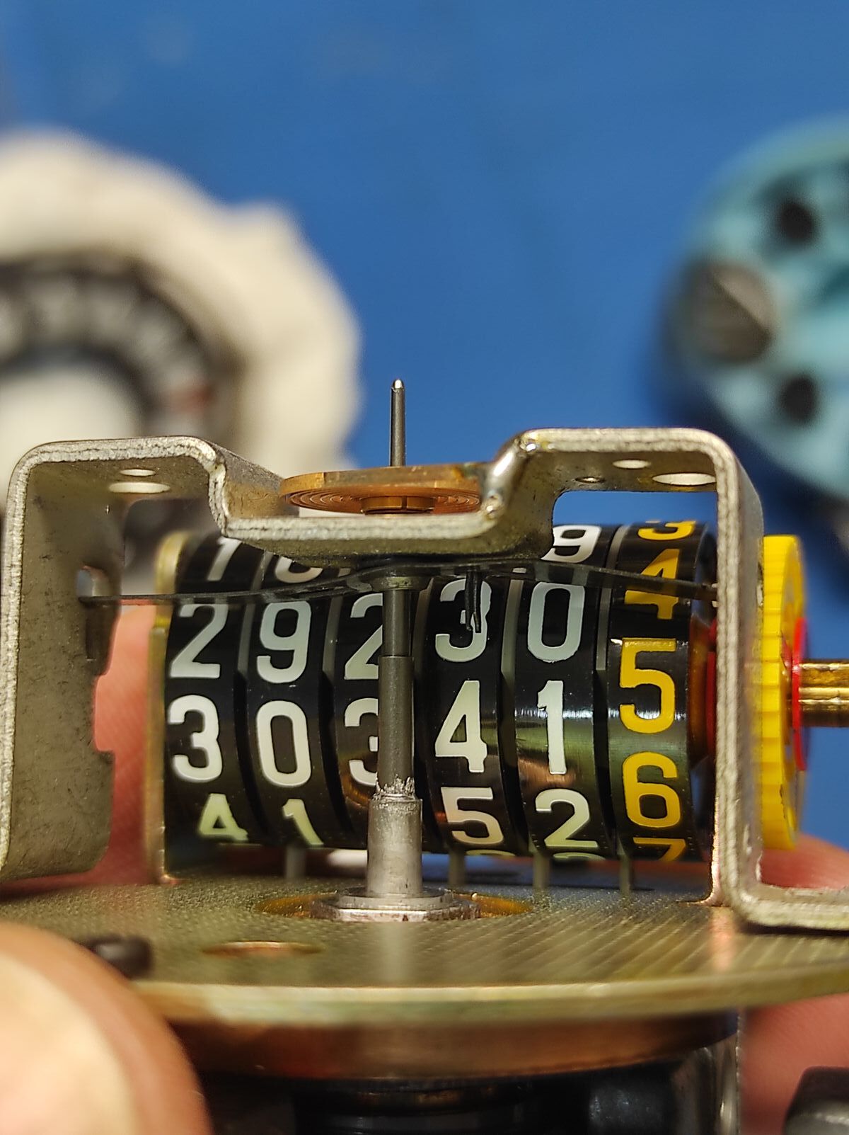 Die Welle von diesem Zahnrad hat gefressen. Dieses treibt am anderen Ende diesen Kunststoffarm an, der dann das gelbe Zahnrad mitnimmt und dieses die weiteren Rädchen mit den km-Zahlen.