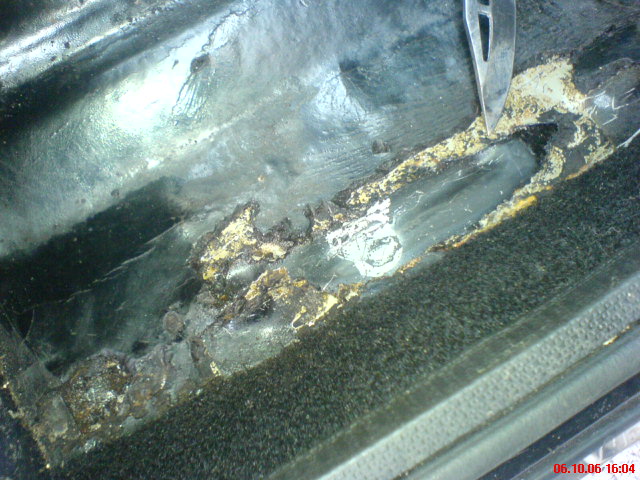 1. Das obere Blech von den beiden (auf dem die Dämmung drauf ist) ist das Unterblech selbst, das untere das Stück vom Schweller, oder? Es wundert mich, dass der Schweller überhaupt keinen Rost zeigt (so weit man das sehen kann). Denn in dem Hohlraum dazwischen (bei der Messerspitze) stand Wasser (!!!), als ich das geöffnet habe.