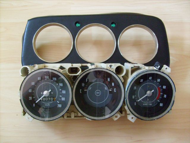 Habe ein komplett funktionstüchtiges Smith 3er Insturment in grau schwarz abzugeben (Tacho, Tank + Wassertemperatur, Drehzahlmesser). Dazu gehört die Blende mit Chromringen, bei der sich der schwarze Kunstlederbezug am Rand teilweise löst. Er müsste neu verklebt oder neu bezogen werden. Die Instrumente sind zum besseren Abfotografieren nicht an der Blende befestigt, kann man aber ohne Probleme wieder dranschrauben.