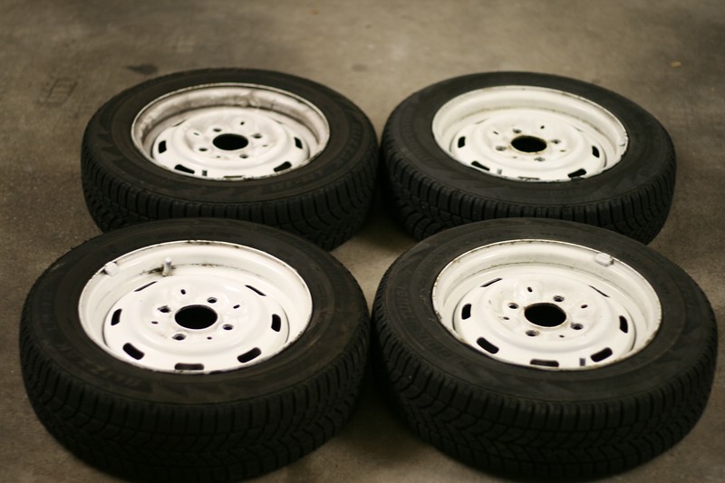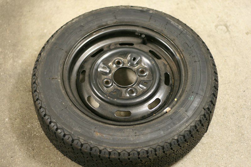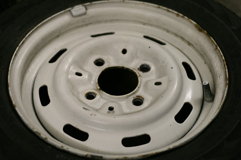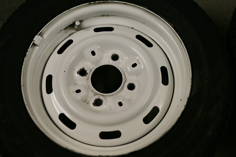Felgen waren schwarz, gefielen mir in weiß aber besser, daher habe ich damals den Flugrost abgeschliffen, grundiert und mit weiß übergesprüht. Habe eine fürs Foto mal provisorisch gereinigt.Dazu habe ich noch einen Ersatzrad auf schwarzer Stahlfelge - nie gebraucht - lag aber im Kofferraum - daher das Aussehen (siehe Bild).