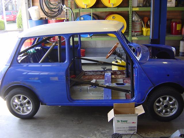 Der Mini ist zurzeit komplett vom Dämmmaterial befreit und ein Wiechers Käfig fand seinen Platz darin. Der Käfig bekam zusätzlich noch Verstrebungen hinten auf die Radkästen und vorne noch eine Quertraverse.