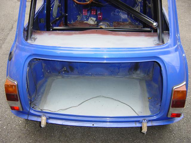 Der Kofferraumboden wurde durch ein gerades Blech getauscht. Darauf soll später mal ein Renntank seinen Platz finden.