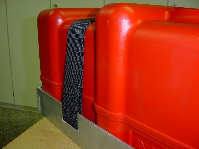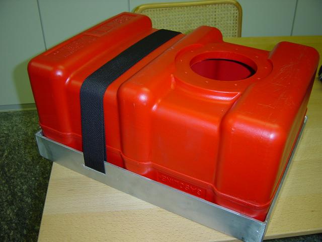 Dann die Batterie am Stahlrahmen noch mit Metallbügeln befestigen, Deckel drauf und diesen mit einem Band festzurren.
