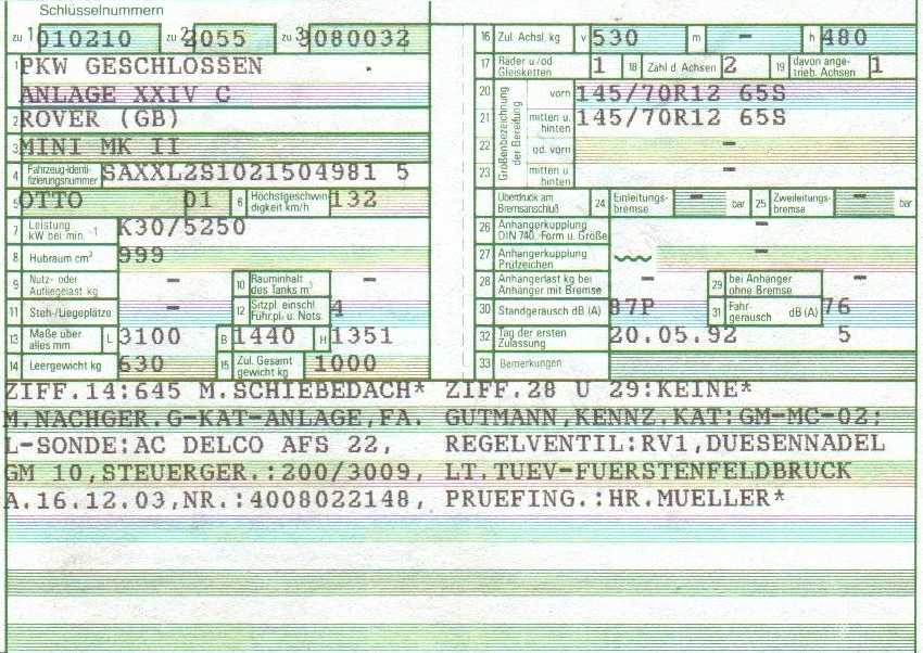 Hat einer mal einen neueren Mini umgelabelt auf Baujahr vor 1978? Oder ist das strikt gesetzeswidrig? Ist doch eigentlich egal, ob ich jetzt eine alte Fgstnr in einen tiptop erhaltenen 92er einsetze oder ob ich ein verrottetes 78er Modell mit lauter neuen Teilen wieder schön mache?