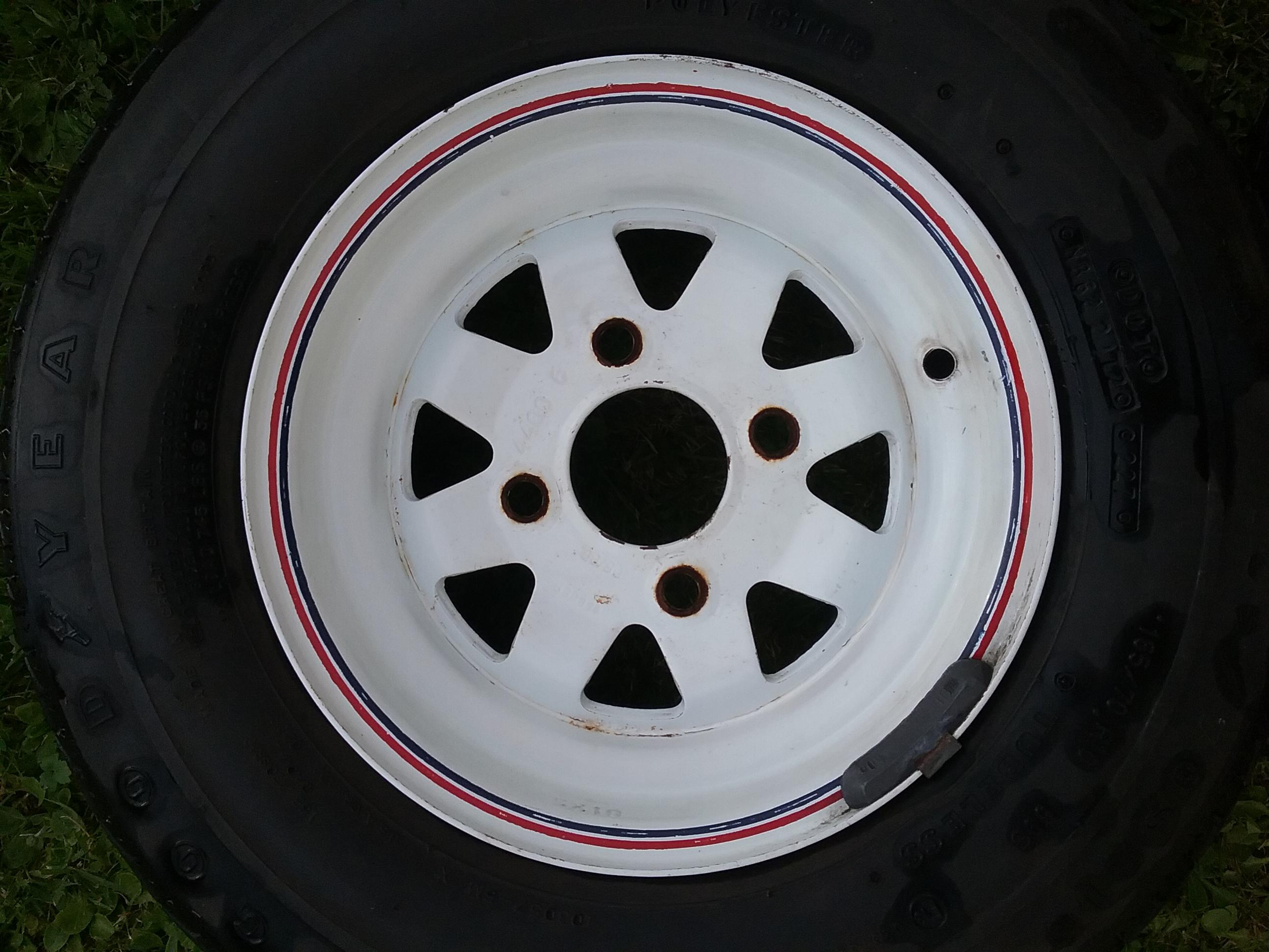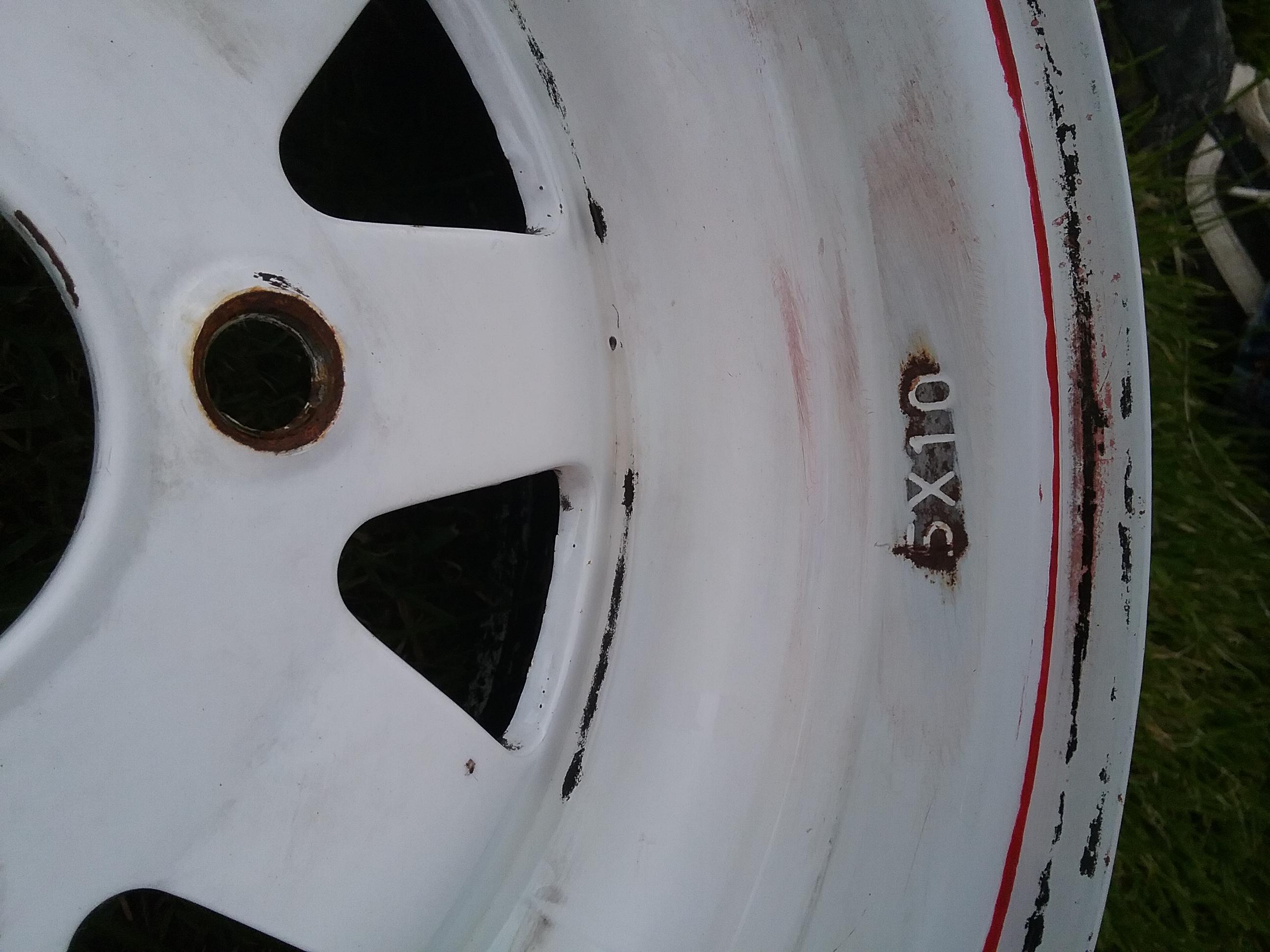 5x10 Weller Felgen, 4 Stück original weiß mit blau-roten Streifen.