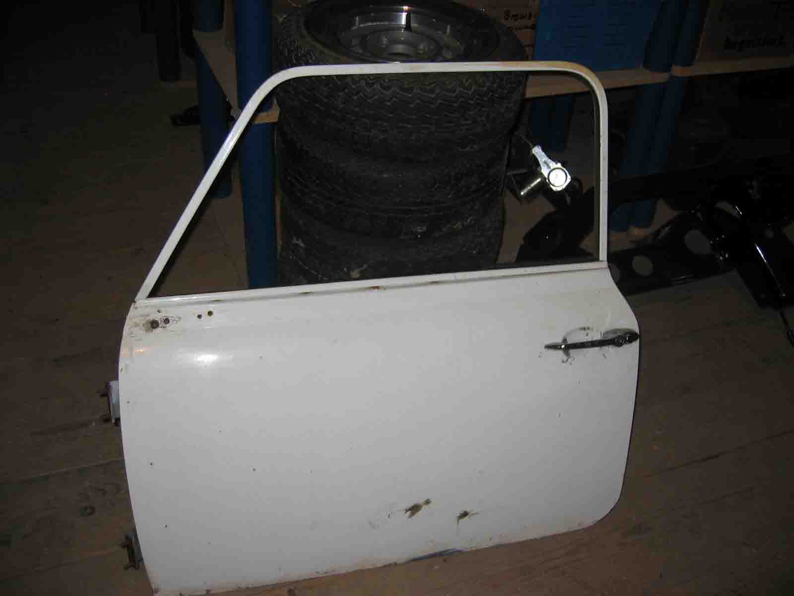 -Türe, Fahrerseite weiß mit Innereien, Schanieren, Öffner und Falzrost, keine Durchrostungen! 80,-
