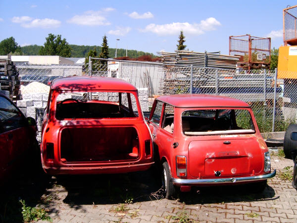 Der zweite Mini (links) ist ein „Red Hot“, d.h. eigentlich nur eine Karosse, welche ich ohne Brief von der örtlichen Autoverwertung gekauft habe. Jemand hat sich einige Arbeit mit dem Kleinen gemacht, rechts den Innen- und Aussenschweller geschweißt, außerdem beide Kotflügel, das Dreiecksblech rechts, die A-Säulen im unteren Bereich usw. Außerdem wurde die rechte A-Säule im oberen Bereich sowie der Scheibenrahmen der Beifahrertür erneuert, leider passt die Tür noch nicht sauber. Ob der fleißige Schweisser aufgegeben hat oder eine Garagenräumung der Grund für den Abbruch der Arbeiten war ist unbekannt. Im Zuge der Entsorgung ist dann wenig zimperlich damit umgegangen worden: die Dachkante ist im vorderen Bereich beschädigt, rechts habe ich vor einiger Zeit grob gerichtet, es ist durchaus machbar. Die Aufnahme des hinteren Hilfsrahmens muss noch gemacht werden, ansonsten ist der Kofferraumboden und Batteriekasten gesund. Überhaupt ist er hintenrum ganz gut beisammen, vorn sind halt Rest- und Feinarbeiten nötig. Soweit ich mich erinnere ist die linke Tür an der Unterkante rostig, die restlichen Hauben/Klappen/Türen okay.