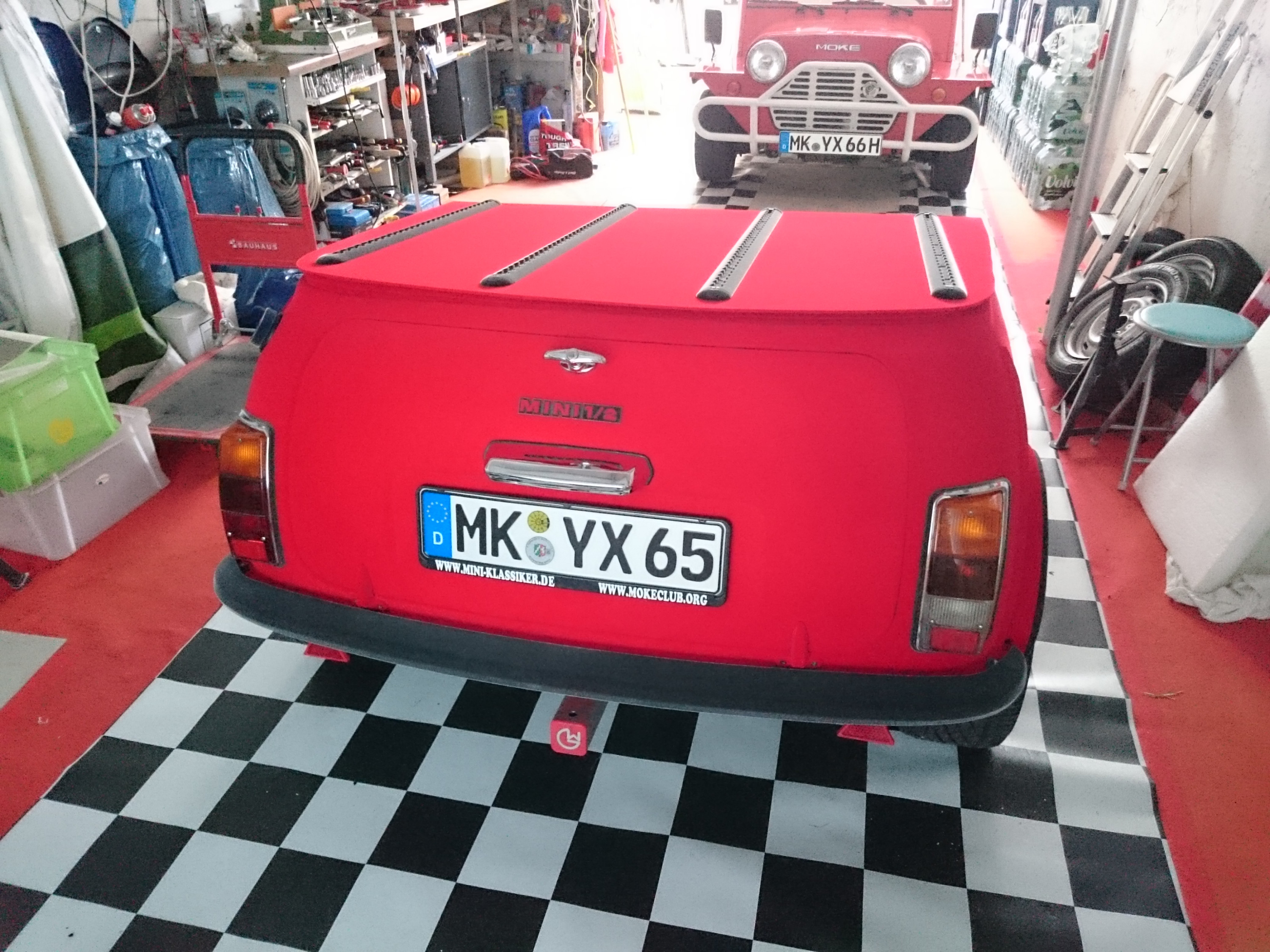 Baujahr 2024. Innen und aussen komplett geflockt, nicht beklebt. Auf dem Deckel aus Dibond, Airlineschienen zum Befestigen von allem möglichem. Auch die Dichtung, die Verbreiterungen und Keder sind geflockt. Zum Reinigen brauche ich eine weiche Bürste und ab und zu etwas Seife und Wasser. Hier von Hinten. Emblem habe ich 3D gedruckt und dann geflockt.